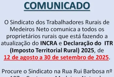 O Sindicato dos Trabalhadores Rurais de Medeiros Neto iniciou o processo de atualização do Instituto ...