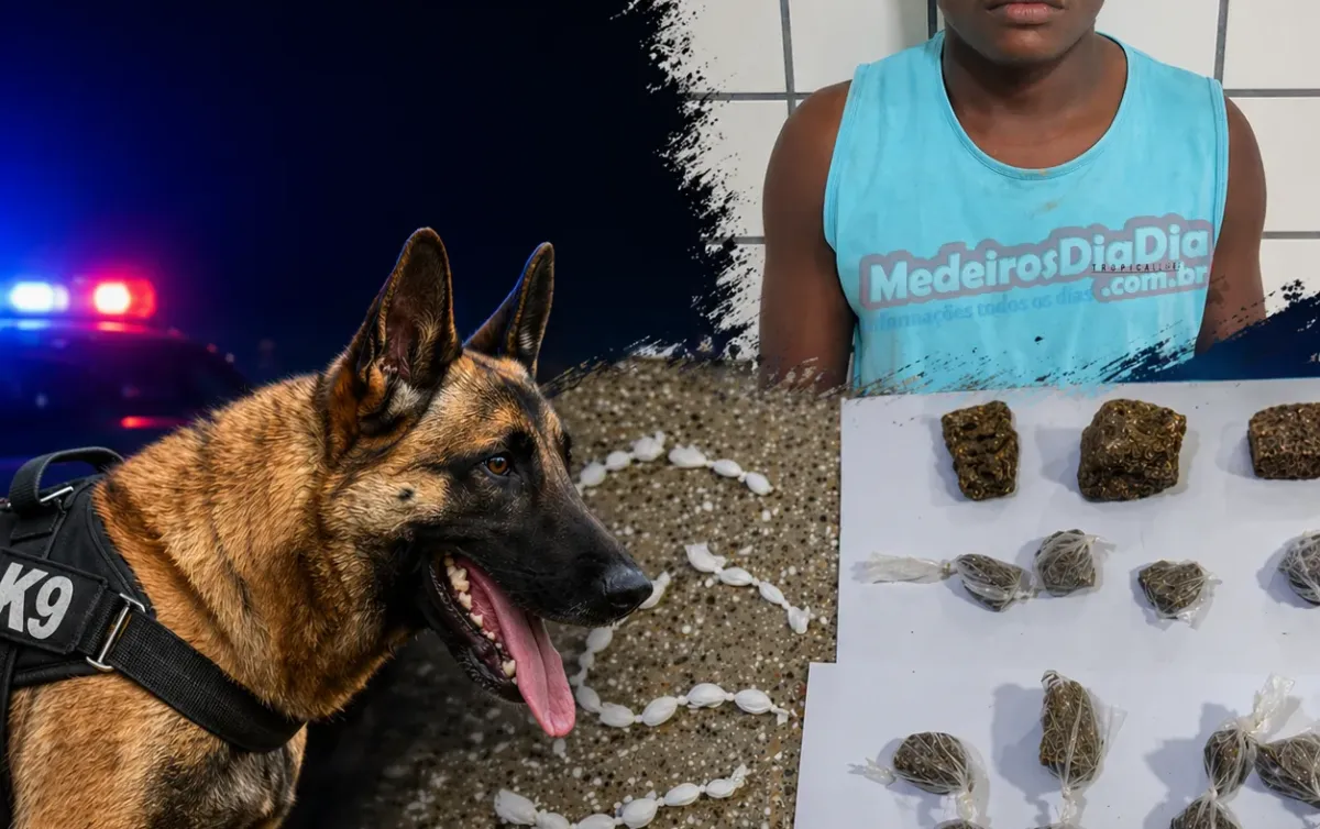 Na área indicada pelo K9, os militares localizaram o suspeito, identificado como Eric Adão Silva, de 18 anos. Ao ser abordado, ele confessou que havia entorpecentes no local. Durante as buscas, foram encontradas porções de maconha e uma vasilha plástica contendo cocaína, que estava escondida sob uma camada de farinha.
