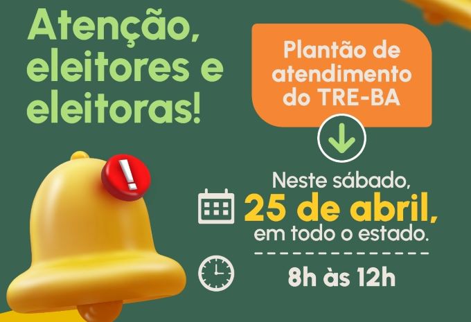 Com a proximidade do fechamento do Cadastro Eleitoral para as Eleições 2026, previsto para o próximo dia 6 de maio, os cartórios eleitorais da capital e do interior, bem como a Central de Atendimento ao Público (CAP) do Tribunal Regional Eleitoral da Bahia (TRE-BA), funcionarão em regime de plantão. O atendimento extraordinário ocorrerá nos dias 25 de abril (sábado); dias 1º e 5 de maio, no feriado do Dia do Trabalhador, sexta-feira e sábado, das 08h às 12h.