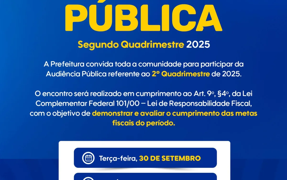 A Prefeitura de Caravelas convida toda a comunidade para participar da Audiência Pública referente ao 2º Quadrimestre de 2025, que será realizada na próxima terça-feira, 30 de setembro, a partir das 9h30, no Salão Nobre da Câmara Municipal.